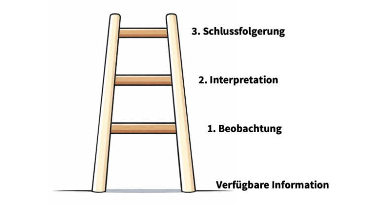 Diesen Prozess kann man sich wie eine „Leiter der Schlussfolgerungen“ vorstellen: Wir beobachten eine Situation, interpretieren sie und ziehen daraus Schlussfolgerungen.