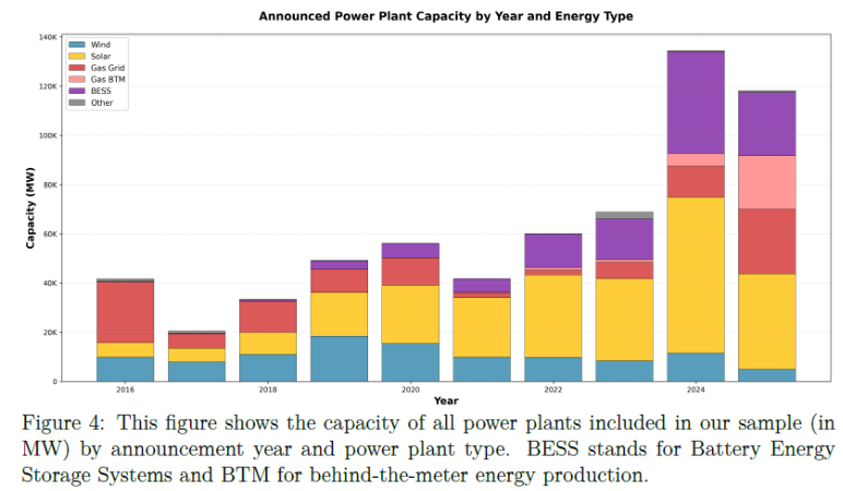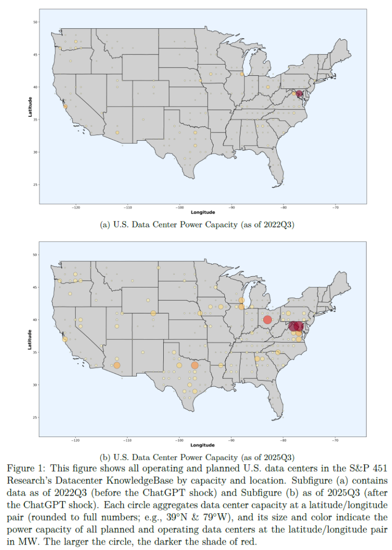 They implement a difference in differences design around this event for “treated” and “control” regions. As treated regions, they classify the 100km x 100km areas hosting the top 10% of pre ChatGPT data-center capacity - these geographical areas host 93% of the entire data-center capacity in the United States as of 2022Q3. Using detailed project level data on power plants, including non-grid-connected behind the meter facilities, they track announced investments in power plants in treated and control regions around the ChatGPT shock.